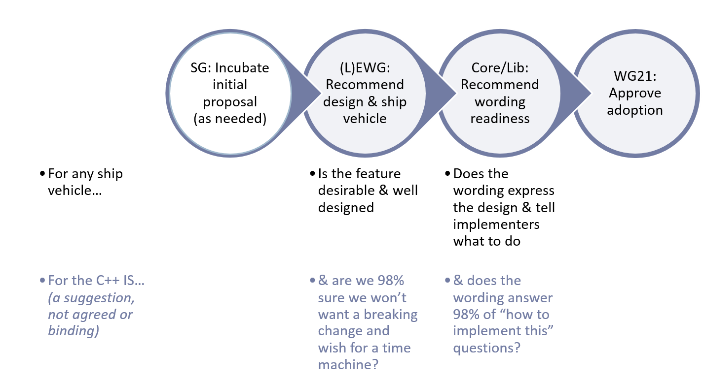The two major levels a proposal has to go through is to get approval from the “design” groups (Evolution Working Group aka EWG, and/or Library Evolution Working Group aka LEWG) and the “wording” groups (Core Working Group aka CWG, and/or Library Working Group aka LWG). Here’s an overview, where the bottom “criteria for adopting work into the C++ IS trunk itself” is just a rough guideline suggestion and will vary by people's comfort with the proposal.