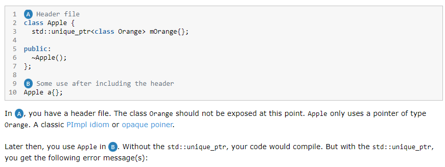 Essentially, this message tells you that thestd::unique_ptrcannot instantiate the required destructor for itself typed withOrange. The simple reason is that, at this point,Orangehas no visible destructor. Which is the entire point of the PImpl idiom. What now?